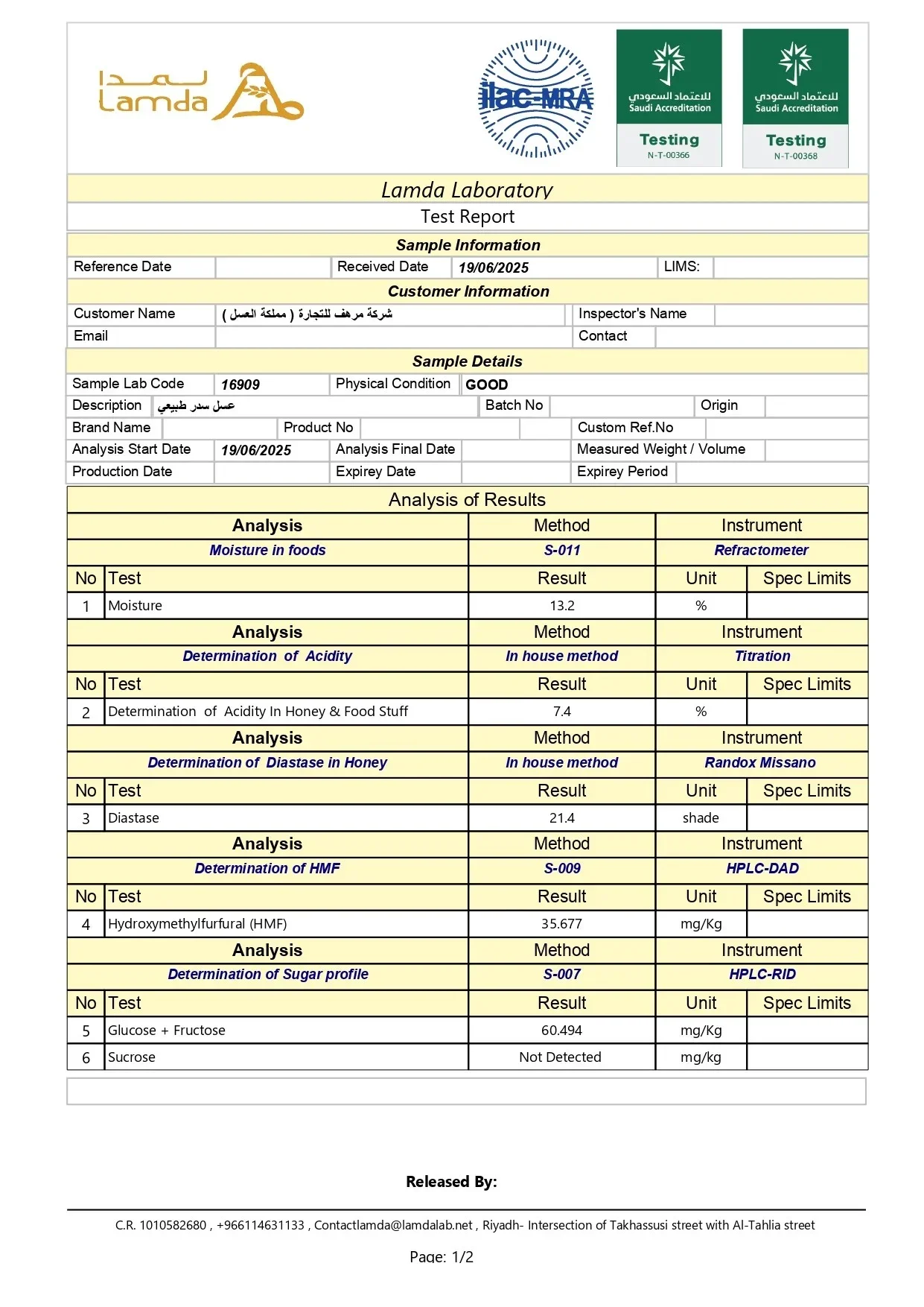 - الرطوبة: 13.2% — ضمن النطاق المثالي لجودة العسل.